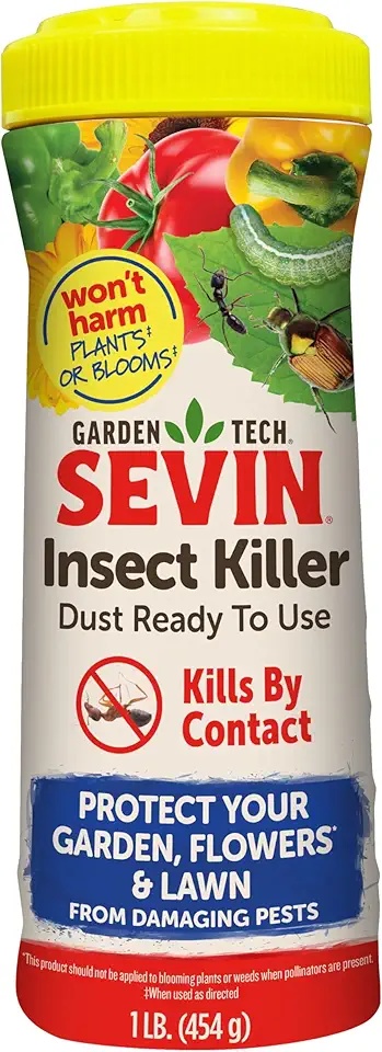 Sevin Insect Killer Dust – 1 pound shaker with white label. Dry powder formula for targeted application on vegetables, flowers, and ornamentals. Easy to use and effective.
